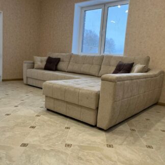 Относительно цветового решения в данном случае просился светлый и плотный велюр, на чем мы в итоге и остановили свой выбор. Относительно жесткости, заказчики просили сделать так, что бы на диване или кресле было бы настолько удобно, что сел и можно уснуть. Полный релакс нам помог создать толстый наполнитель пены с памятью Мемори форм, а так же искусственный латекс.